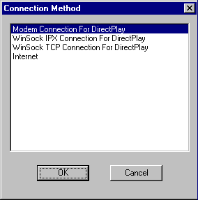 This command lets you get in on games that are currently running. You'll be presented with the Connection Method screen, in which you choose the data-transmission method. The Modem Connection method requires the phone number of the server machine's modem, and the Internet method requires the IP address of the server machine. The Winsock connections presume you're on an existing network.