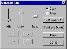 This command is only for the server machine player, bringing up the Generate City dialog in which the host can experiment with designing and redesigning the landscape before the game begins. Once the game has been saved, this command is no longer available. See the Tutorial manual for an overview on terrain design.