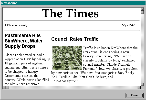 This command lets you read the local paper. The paper will initially be delivered at game startup, and periodically thereafter. Newspapers announcing disasters will be also be immediately delivered. Your city's newspaper is your link to your citizens. Reading it keeps you informed, not only of current events, new inventions, city-development announcements and other important or disastrous occurrences, but also of public-opinion polls. Watch your paper closely to see what is important to your Sims.